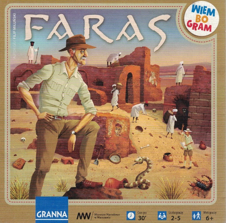 Faras / Filip Miłuński ; il. Adam Pękalski. - Warszawa : Granna, [2014]. - 1gra (plansza, 30 kart, 64 żetony, 1 znacznik) : karton, papier, kolor ; w pudełku 20x20x6 cm. + instrukcja