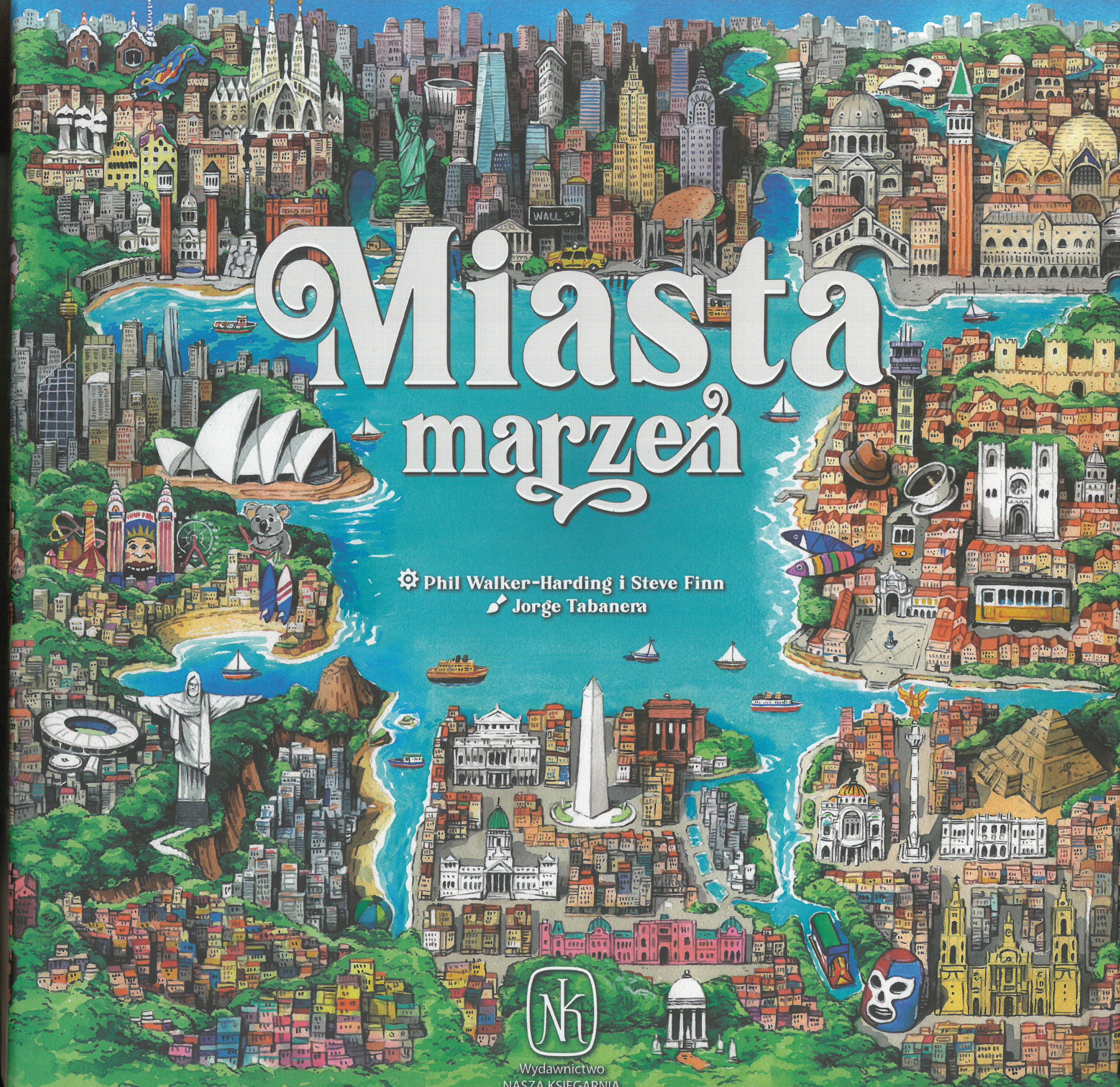 Miasta marzeń/ Steve Finn, Phil Walker-Harding ; ilustracje Jorge Tabanera. - Warszawa : Nasza Księgarnia, [2024]. - 1 gra (100 budynków, 36 płytek miast, 48 miejskich atrakcji, 32 pionków robotników, 32 karty celów, 8 miast, 16 znaczników graczy, 4 ściągawki dla graczy , 1 plansza, 1 worek na budynki, 1 znacznik gracza rozpoczynającego) :karton, papier,plastik, kolor ; w pudełku 23x23x6 cm. cm + instrukcja