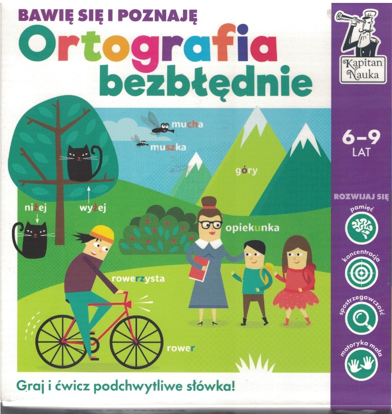 Kapitan Nauka. Ortografia bezbłędnie to zestaw zabaw, które ułatwią dziecku zrozumienie zasad pisowni języka polskiego. Wykorzystajcie karty obrazkowe do aktywnych gier i zabaw, a szybko poznacie i zapamiętacie najważniejsze reguły ortograficzne. Dodatkową inspiracją będą pomysły zebrane w poradniku, dzięki którym można dostosować metody nauki do preferencji dziecka oraz dyktanda i ćwiczenia do utrwalania poznanych zasad w praktyce. Pakiet 220 kart jest podzielony na cztery talie, w każdej z nich znajduje się 50 kart ze słówkami i 5 specjalnych, z podsumowaniem wybranych zasad pisowni. Zestaw szczególnie przyda się uczniom szkół podstawowych w klasach 1-3, które rozpoczynają swoją przygodę z językiem polskim. [Eduksięgarnia]