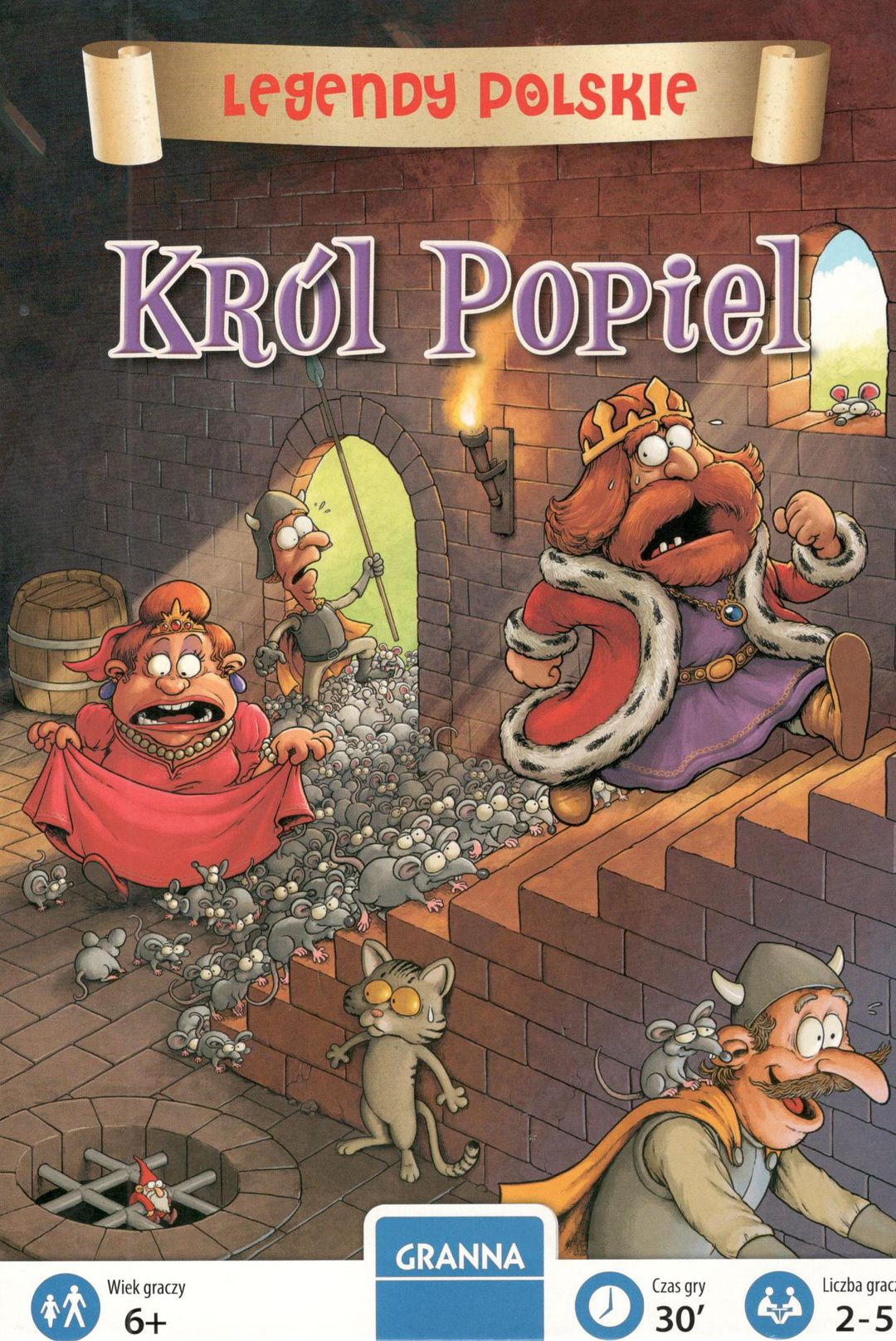 Król Popiel / Jan Madejski ; ilustracje Grzegorz Molas. - Warszawa : Granna, copyright 2018. - 1 gra (dwustronna plansza, 36 kafli z myszami, 5 pionków myszy, pionek króla Popiela, 8 żetonowych nagród, 5 dwustronnych znaczników, 6 podstawek) : plastik, tektura, kolor ; w pudełku 6x19x28 cm + instrukcja (12 stron : ilustracje ; 15 cm).