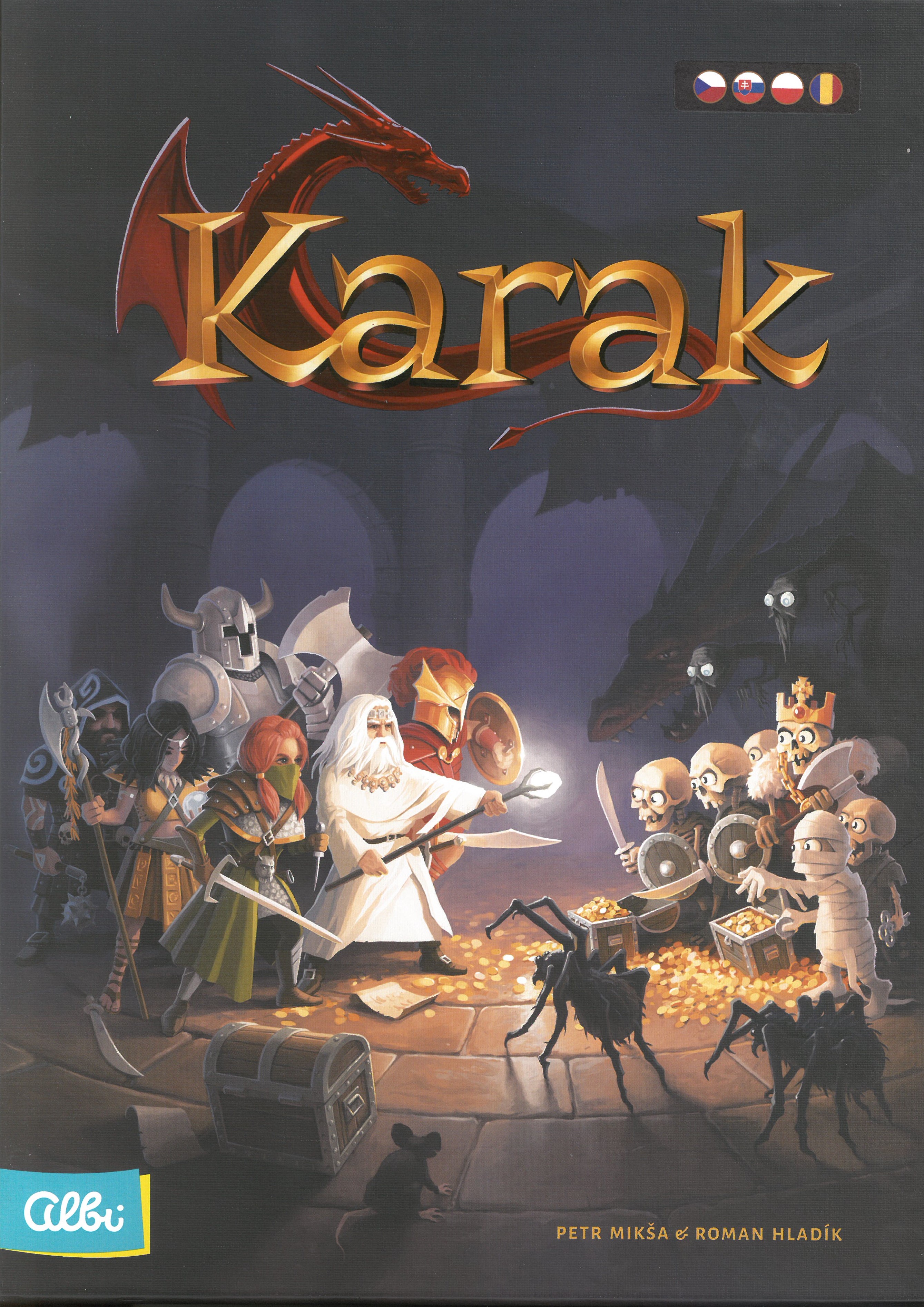 Karak / Peter Miksa, Roman Hladik. - Kraków : Albi, [2017]. - 1 gra (80 kafelek podziemi, 6 pionków bohaterów z podstawkami, 6 kart bohaterów, 5 kart wyposażenia, 30 żetonów punktów wytrzymałości, 43 żetony z potworami, 10 żetonów skrzyń ze skarbami, 2 kostki gry, 1 żeton klatwy, woreczek na żetony potworów i skarbów, ilustrowaną księgę) : karton, papier, kolor ; w pudełku 32x23x7 cm + instrukcja.