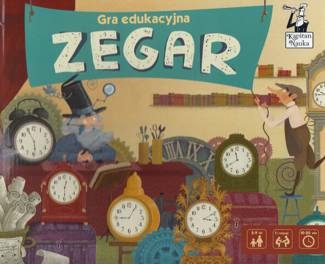 Zegar : gra edukacyjna / redakcja Hubert Bobrowski, Renata Kicka ; ilustracje Marcin Minor, Katarzyna Urbaniak. - Warszawa : Edgard, 2018. - 1 gra (1 dwustronny zegar, 4 dwustronne plansze, 36 żetonów z godzinami) : karton, tektura, kolor ; w pudełku 23x27x6 cm + instrukcja (6 stron : ilustracje ; 22 cm).