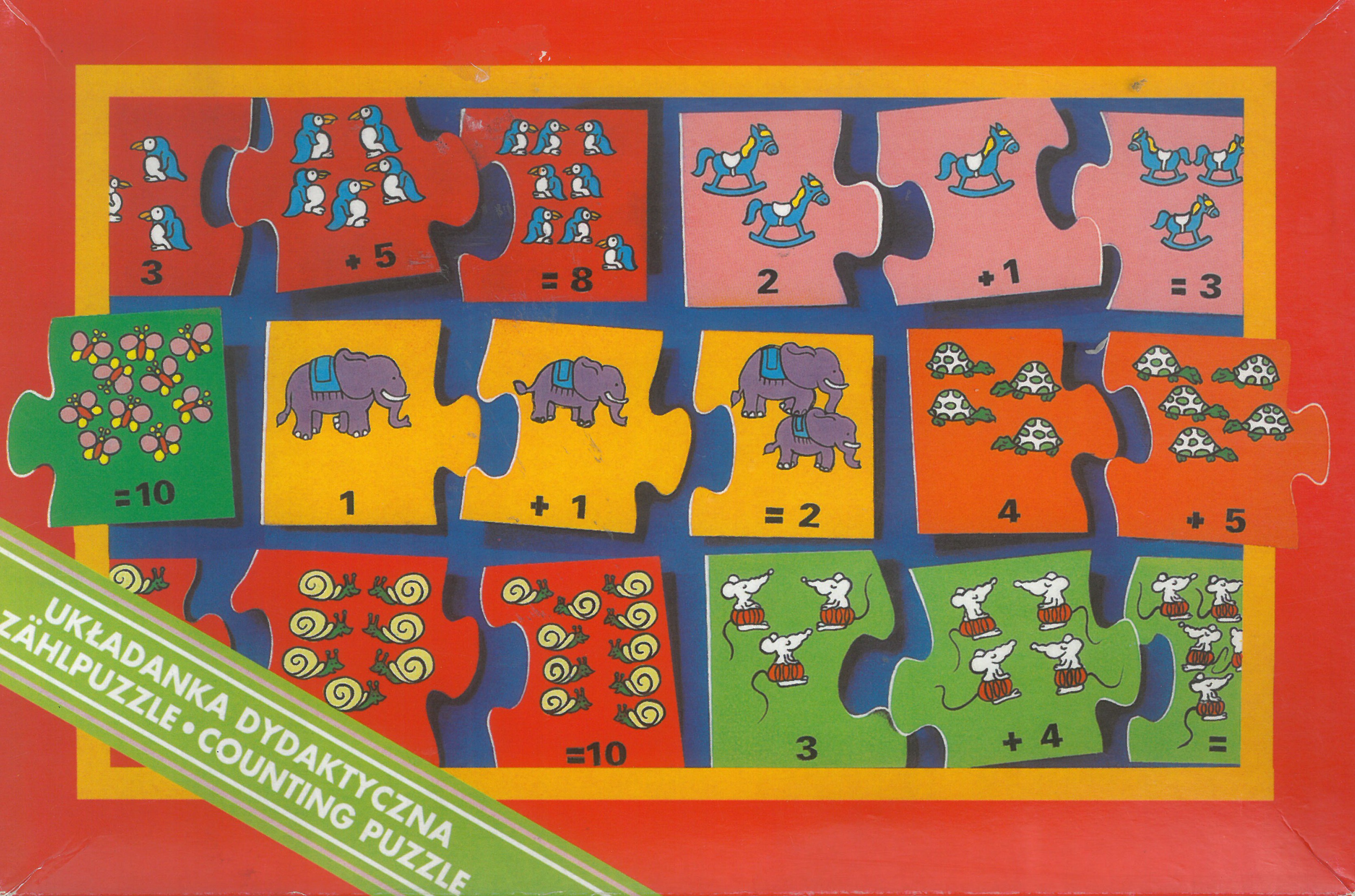 Układanka dydaktyczna do nauki liczenia. Za pomocą odpowiednich elemantów pasujących do siebie puzzli i obrazków kojarzących się z daną liczbą, dziecko uczy się odejmowania, a także rozwija wyobraźnię. Zawartość pudełka: składa się z 12 obrazków (działań). Każdy obrazek podzielony jest na trzy liczby (puzzle). Gra przeznaczona: dla dzieci od 3 lat.