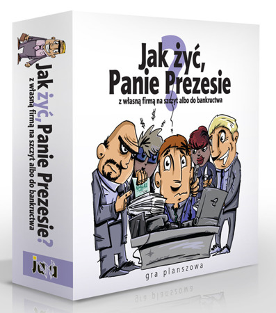 Jak żyć, Panie Prezesie ? : z własną firmą na szczyt albo do bankructwa. - Seria 2. - Nowa Iwiczna : Jawa, [2015]. - 1 gra (1 plansza, 7 kart postaci, 94 karty zdarzeń, 22 kart pracowników, 40 kart dóbr, 11 kart pożyczek, 40 kart okazji, 6 kart spółek, 1 kostka, 7 pionków, 7 podstawek do pionków, pieniądze) : karton, tektura, plastik, kolor ; w pudełku 25x25x6 cm + instrukcja (4 strony ; 22 cm).