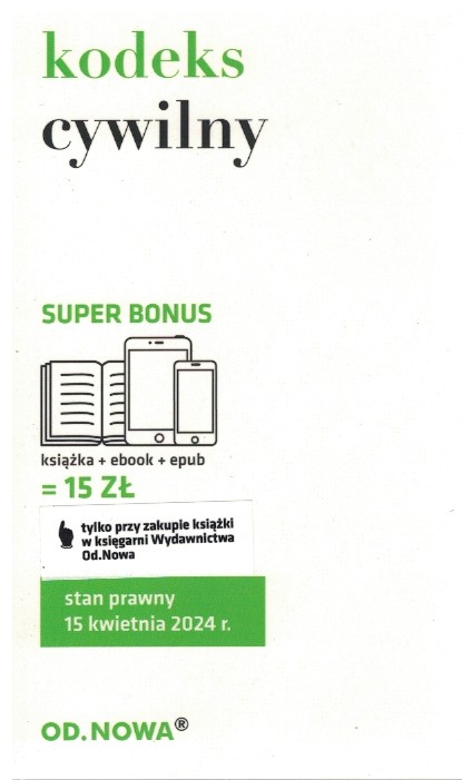 Kodeks cywilny : skorowidz / [opracowanie redakcyjne i merytoryczne Agnieszka Kaszok]. - Wydanie 18, stan prawny: 15 kwiecień 2024 r. - Bielsko-Biała : Od.Nowa, [2024]. - 280 strony ; 18 cm.