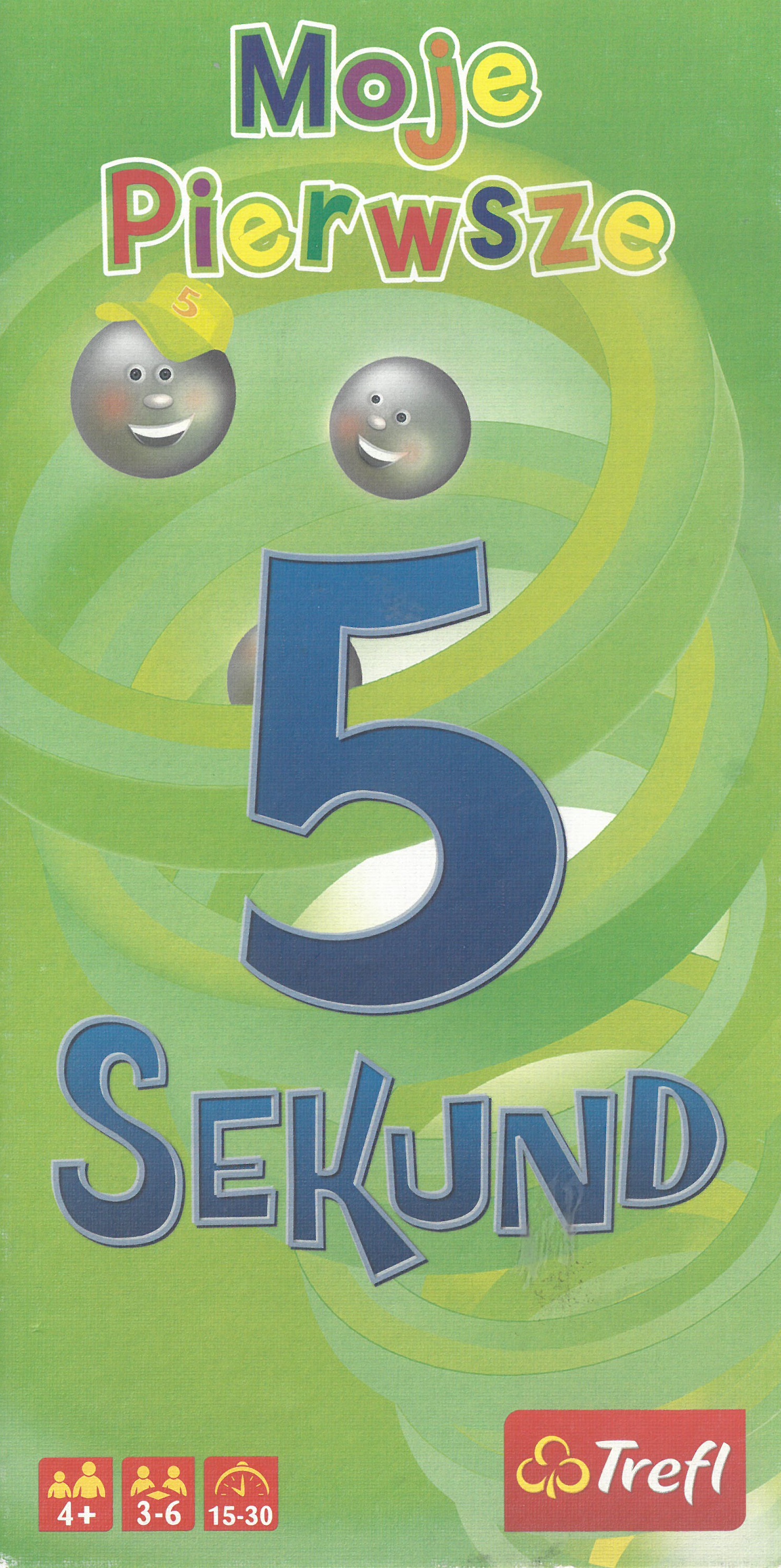 Moje pierwsze 5 sekund. - Gdynia : Trefl, [brak roku]. - 1 gra (144 karty z pytaniami, 6 kart "Czas", 6 kart "Zmiana", 1 specjalny czasomierz) : karton, papier, plastik, kolor ; w pudełku 26x13x8 cm + instrukcja.